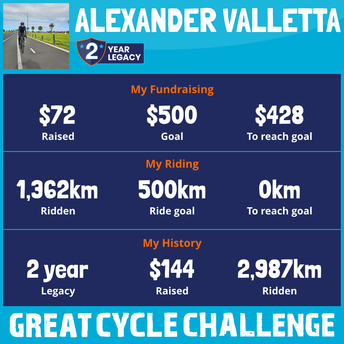 1,362 km Ridden$72 Raised2026