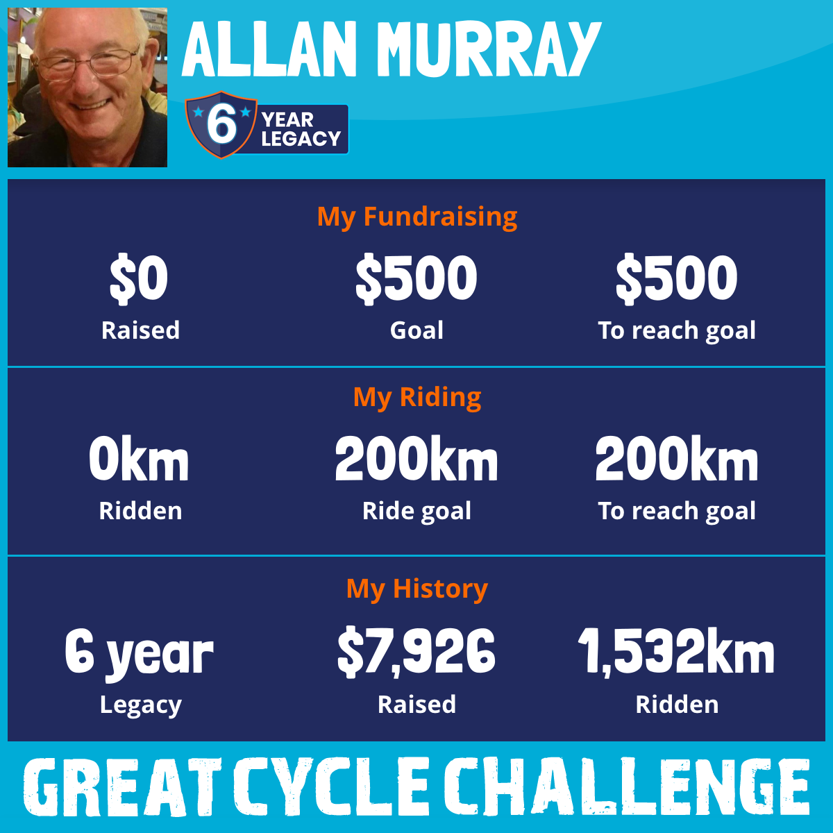 My name is Allan Murray, and as a 75 year old cyclist I'm promising to ride 300 kilometres in the month of October as I take part in the Great Cycle Challenge which raises funds to fight against those mongrel diseases, CHILDHOOD CANCERS.