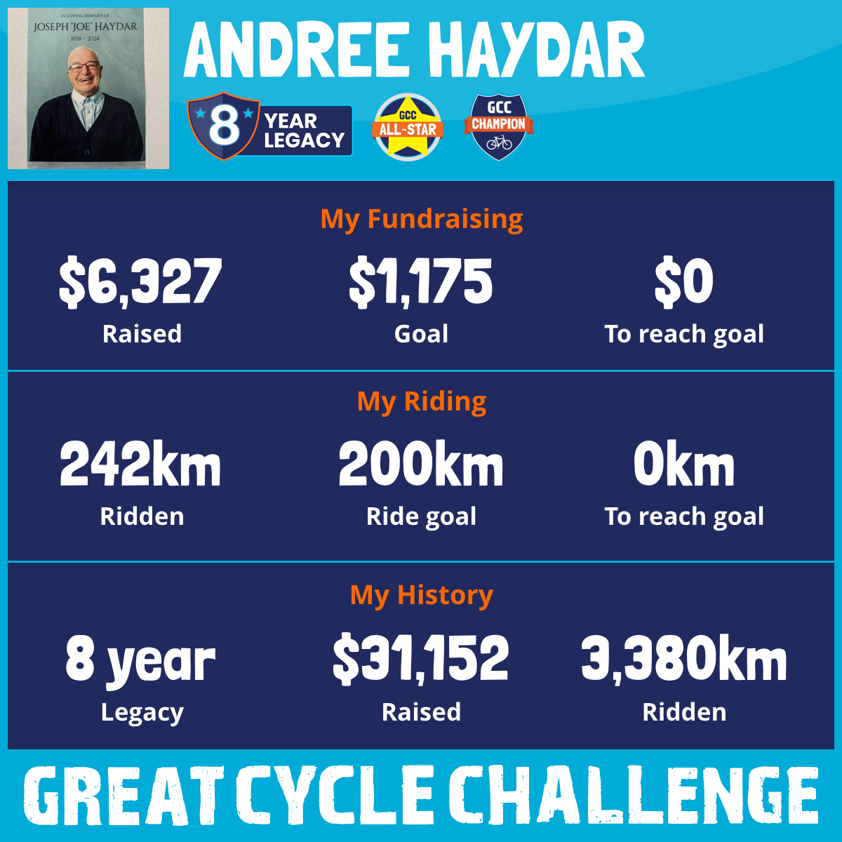 It's that time of the year again, I am taking part in the Great Cycle Challenge to fight kids' cancer! for the past 7 years I have ridden 2,932 km and thanks to the generosity of my amazing Family & Friends I have raised $20,246!