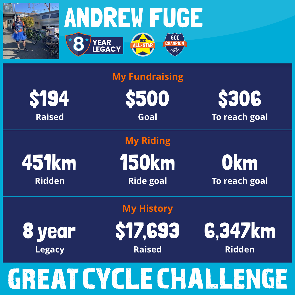 This October, in memory of my mum who passed away from Cancer, I am cycling 400km in her memory also aim to raise $2500, and is also my 7th year for The Great Cycle Challenge to fight kids' cancer as no-one should have to battle cancer regardless of their age.
