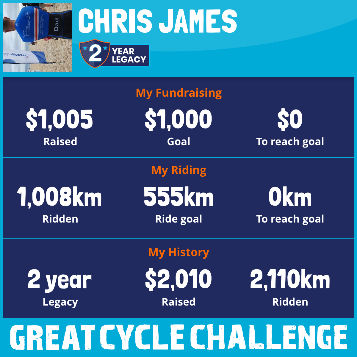 1,008 km Ridden$1,005 Raised2026