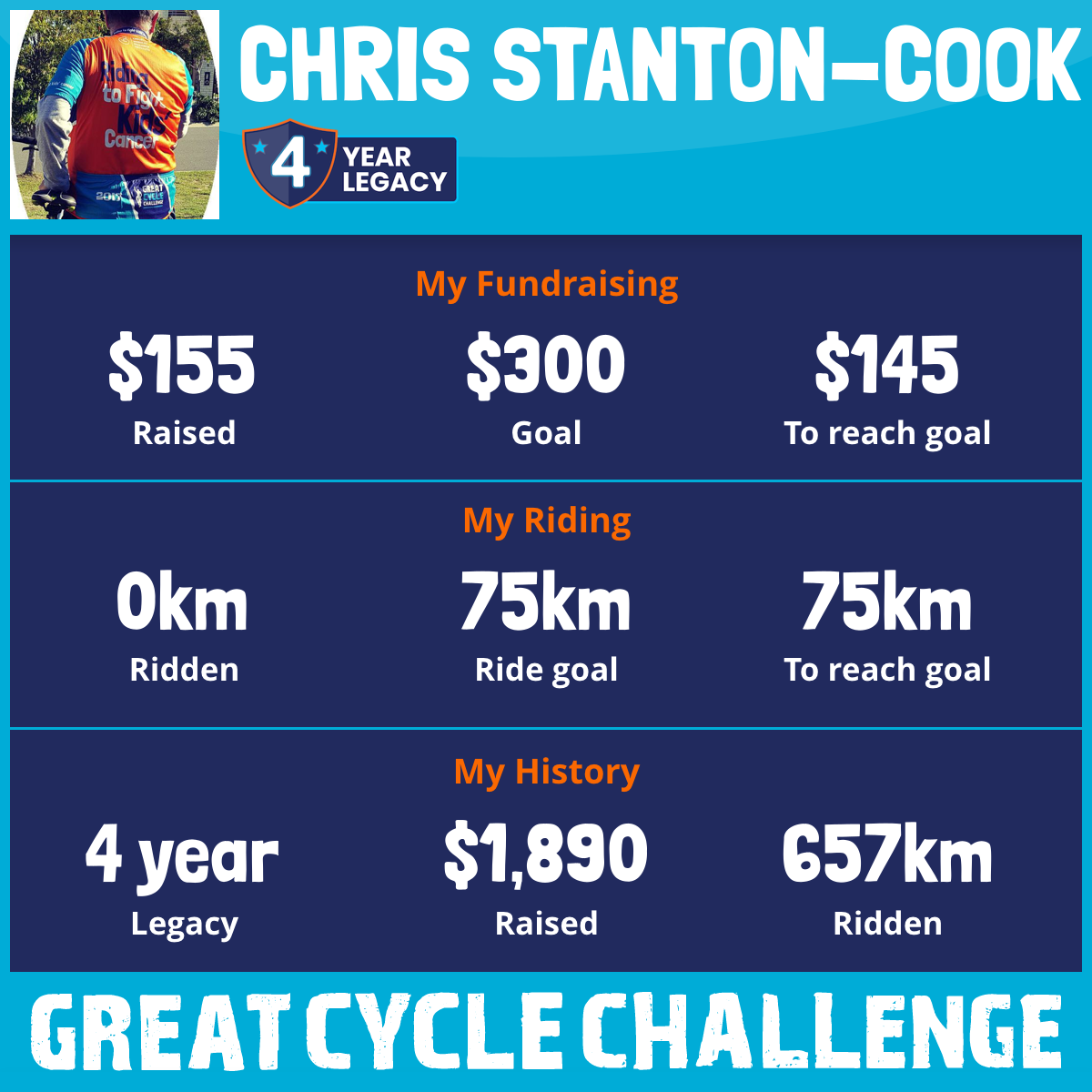 If you’ve ever been touched by cancer, personally, through family, or a friend, you’ll know how horribly it affects everyone. Once again , this September, I’m riding in the Great Cycle Challenge to help raise funds to Fight Kids’ Cancer. Every kilometre I ride is for the kids and others doing it tough—and for the families and friends going through a time no one should have to. If you can chip in and support this cause, please do. Every dollar helps fund research to find better treatments, ease suffering, and maybe one day stop cancer before it starts. Thank you. Let’s make a difference together and fill the research pot with gold and add some colour to the lives of the cancer kids. 💛