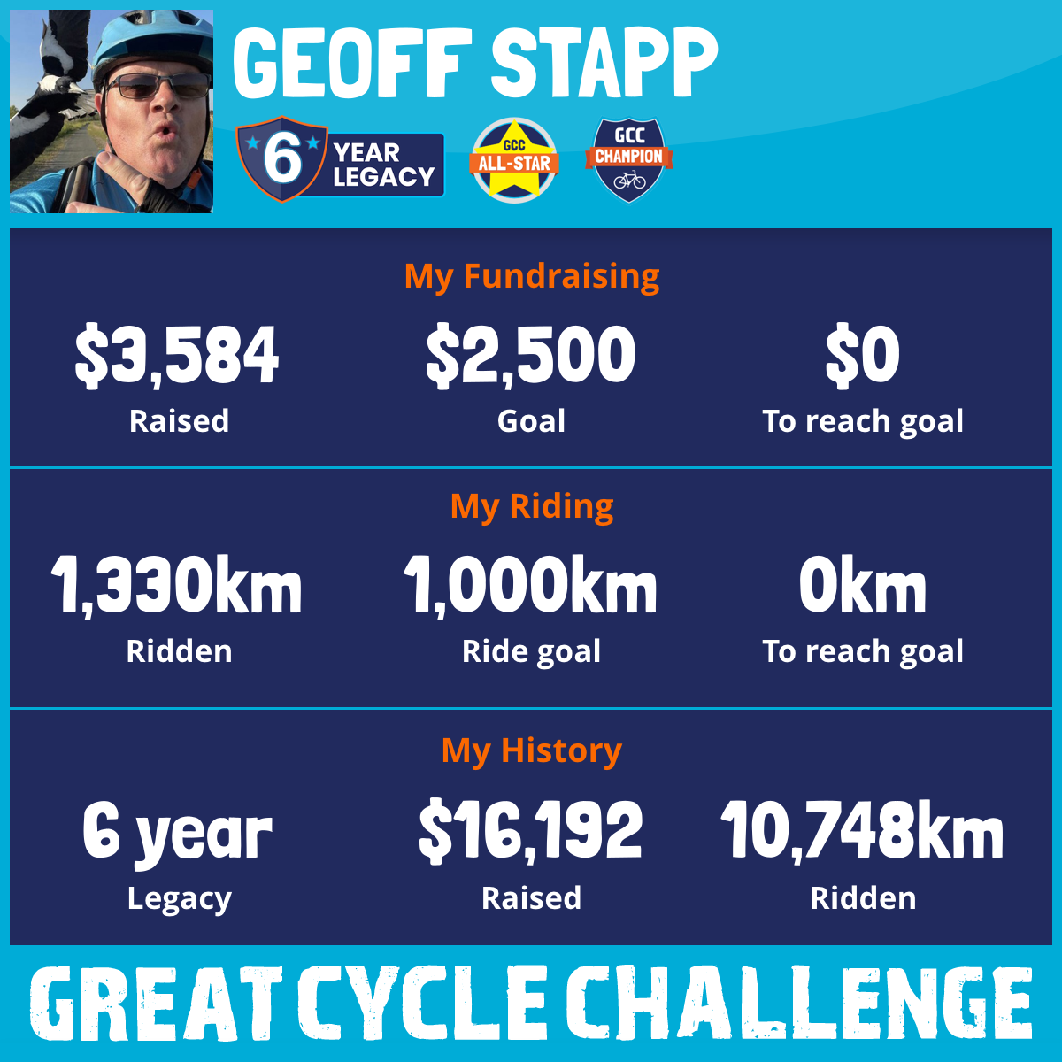 1,330 km Ridden$3,584 Raised2026