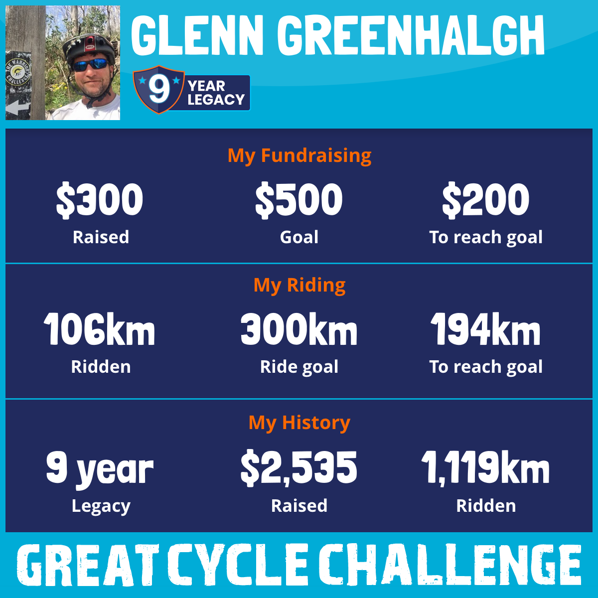 300 km Ridden$1,309 Raised2023
