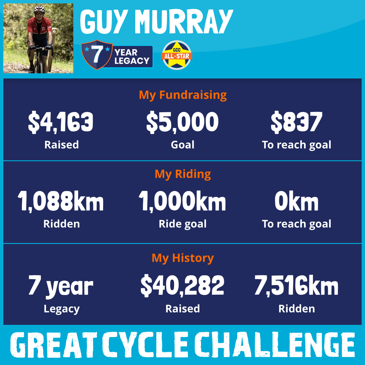 1,088 km Ridden$4,163 Raised2026