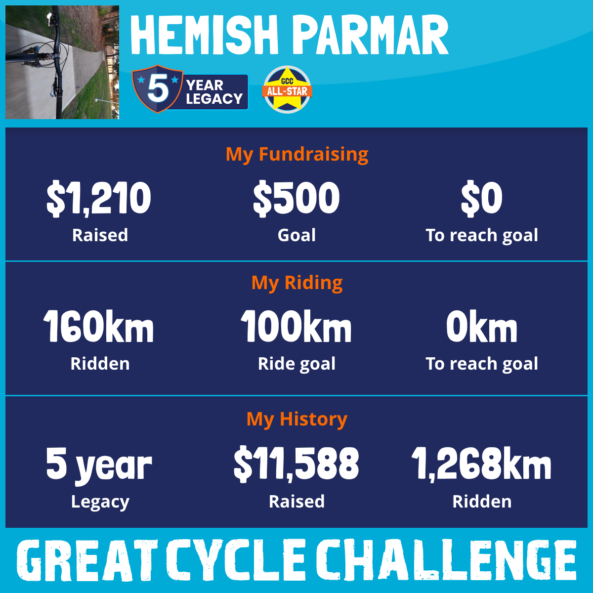 160 km Ridden$1,210 Raised2026