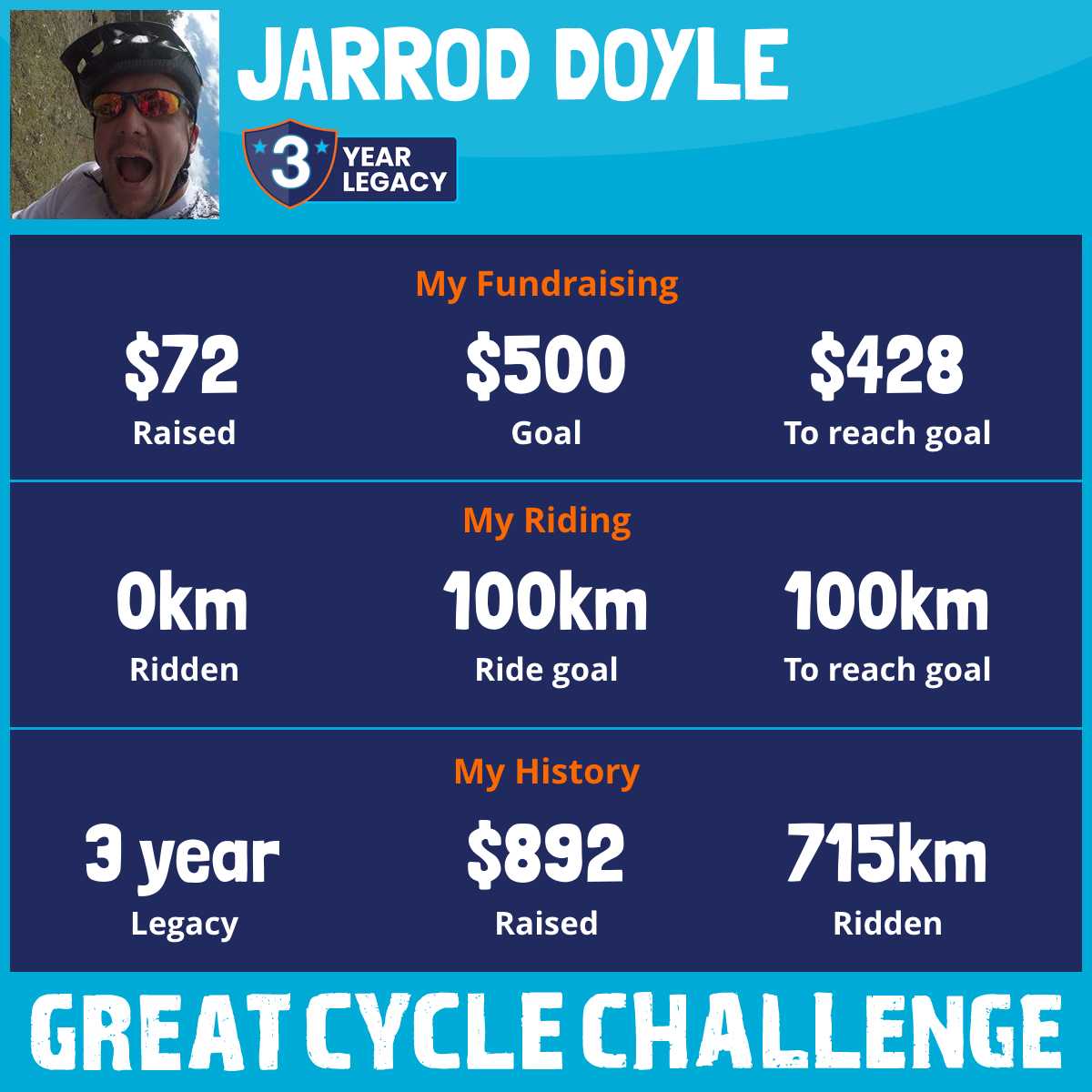 As an added bonus, I am willing to ride 1km for every $1 donated so if we manage to raise $760, then I'll ride 760km!