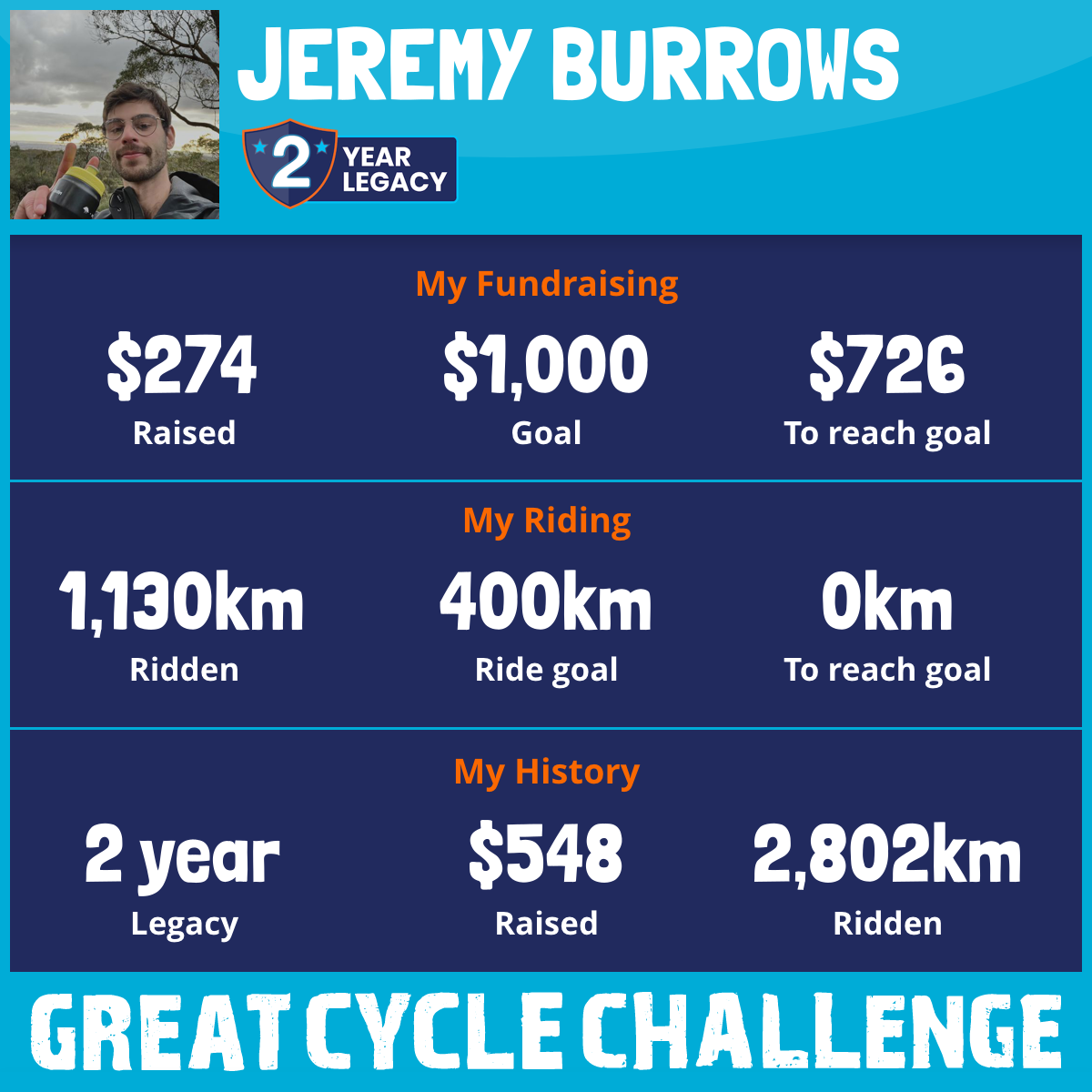 1,130 km Ridden$274 Raised2026