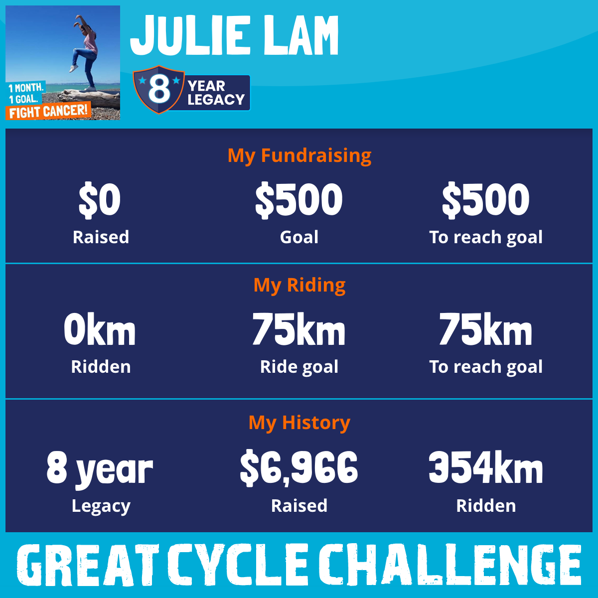 I am not a cyclist, I've ridden my bike a grand total of 2 times since GCC2018 ended - BUT - I still have a bike, that is collecting dust so this is my chance/excuse to dust it off and continue OUR MISSION to fight kids' cancer.