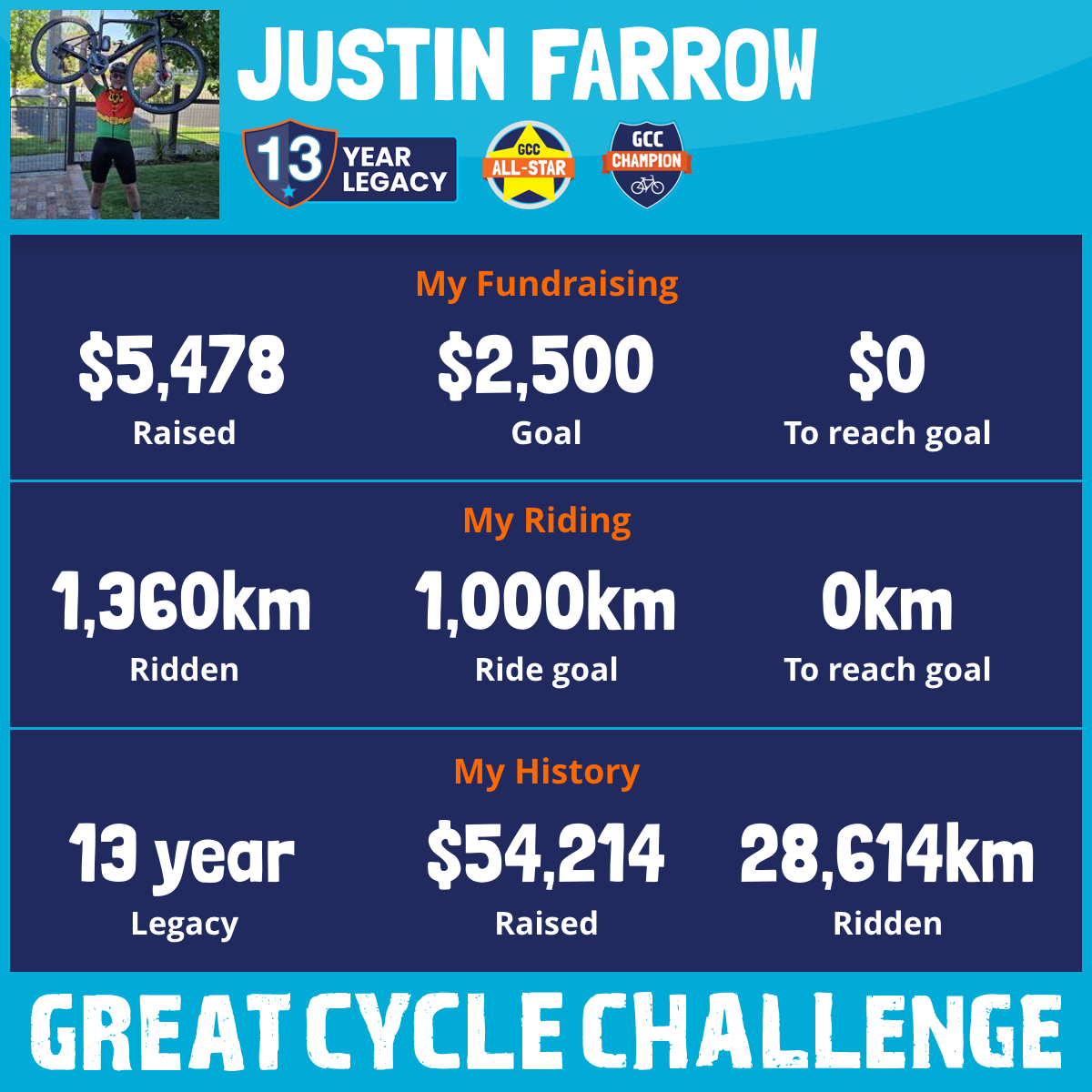 1,360 km Ridden$5,478 Raised2026