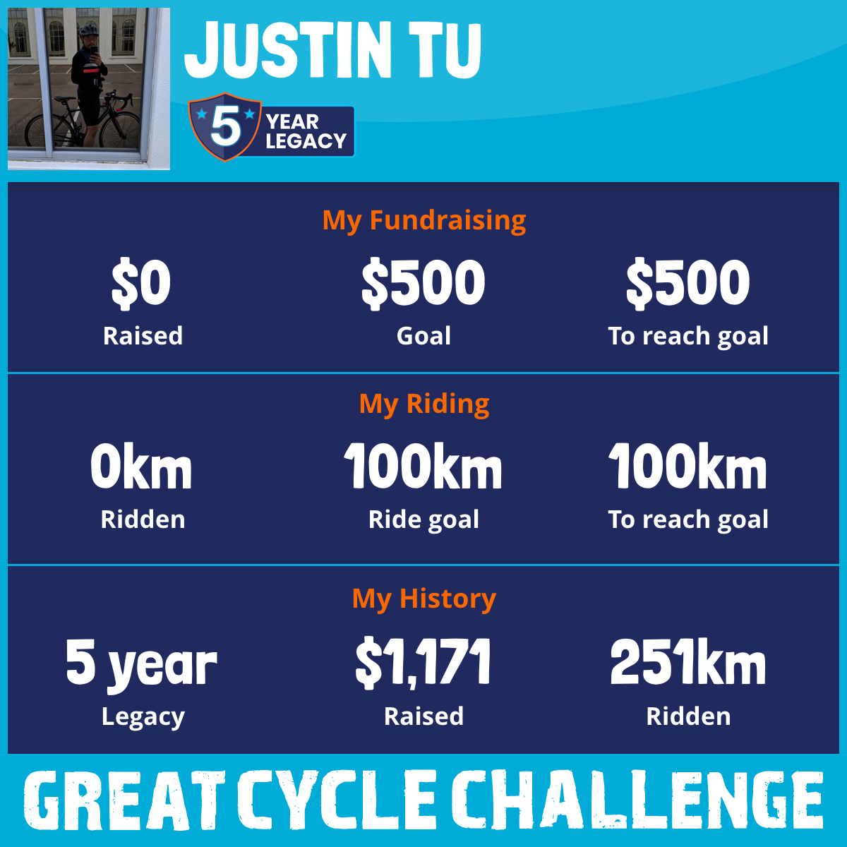 Please sponsor me in my 250km ride which will be a combined journey of outdoor riding and indoor Zwift session on trainer. I will also cycle additional 2km per $1.00 on top of my $500.00 donation goal. For example, I will ride an extra 100km if it hits $550.00!!!