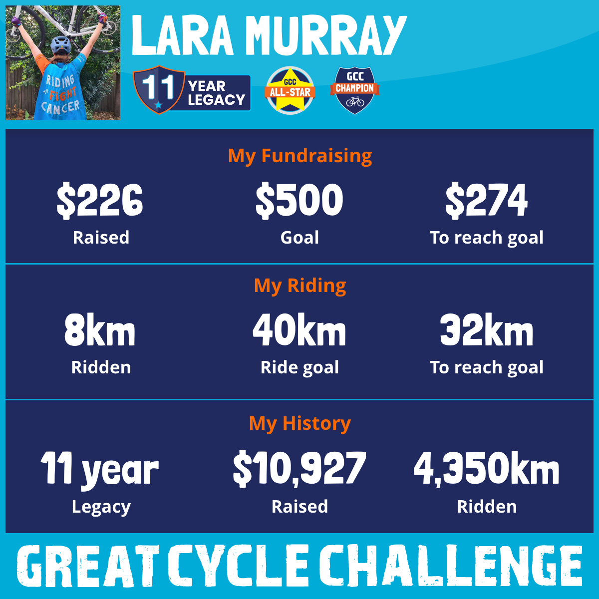 And so I am riding and raising funds to support the Children's Medical Research Institute to continue their work into the prevention, diagnosis, treatment and finding a cure for childhood cancer.