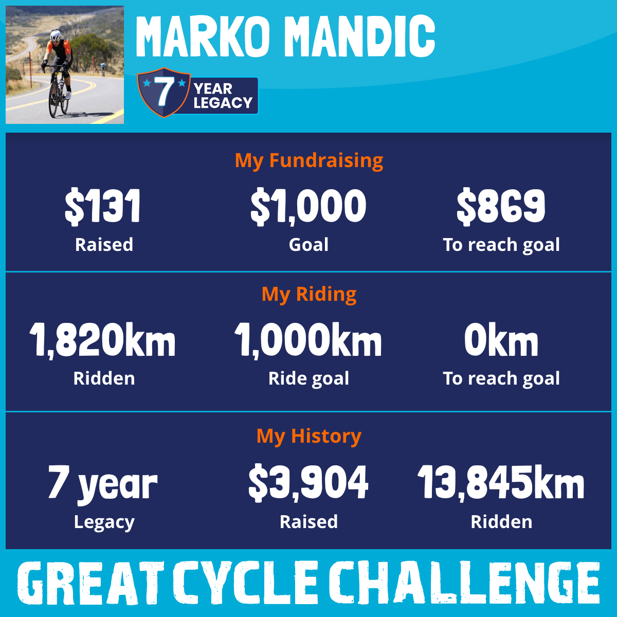 1,820 km Ridden$131 Raised2026