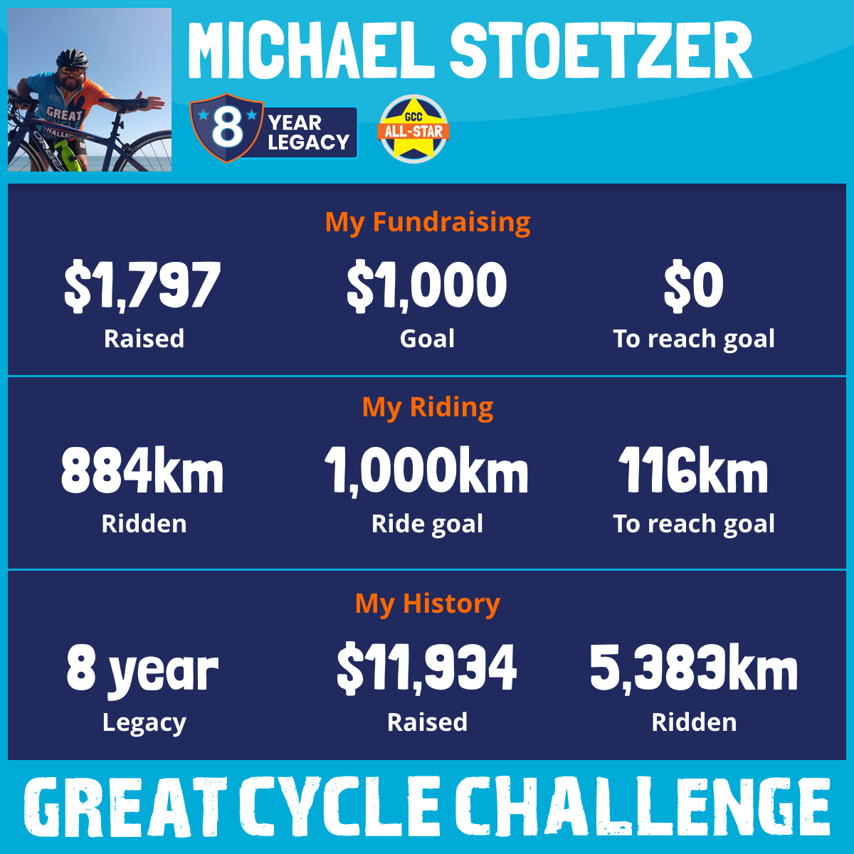 Join me in the fight against childhood cancer! For the eighth year in a row, I'm cycling in the Great Cycle Challenge to support the Children's Medical Research Institute. Every dollar counts towards finding a cure for this devastating disease that affects over 600 Australian children annually. Let's give these kids the brighter futures they deserve. Donate today and help make a difference.