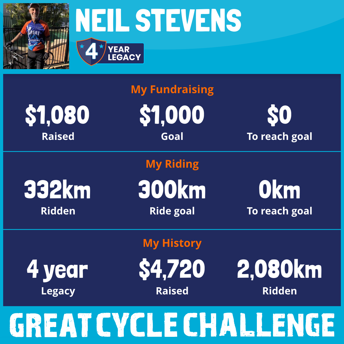 332 km Ridden$1,080 Raised2026