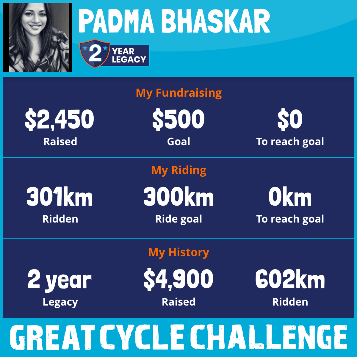 301 km Ridden$2,450 Raised2025
