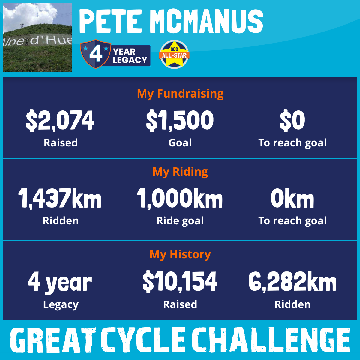 Hi Everyone it’s October again. And this year I am taking part in my 4th Great Cycle Challenge and again like each of the previous three. I’m riding to fight kids' cancer!