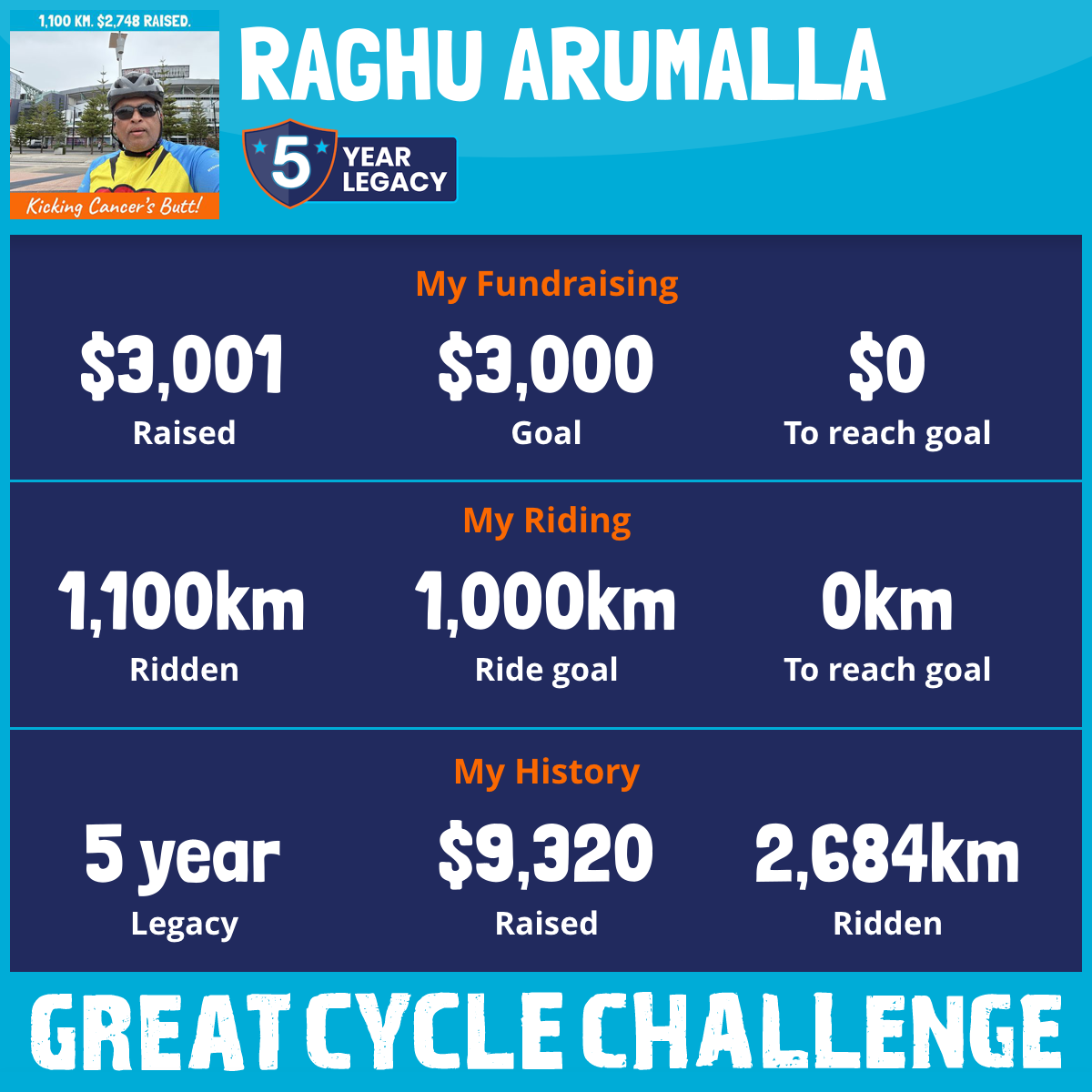 1,100 km Ridden$3,001 Raised2026