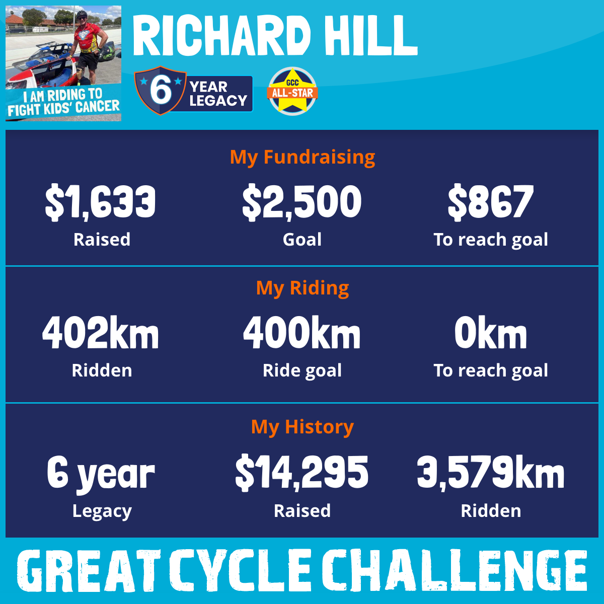 This is my SIXTH year doing the Great Cycle Challenge. Last year, with generous donations, WE raised over $3400 to go directly to the Children's Medical Research Institute cancer research team. Add to that the totals from previous years, a grand total of $12,700! FANTASTIC!