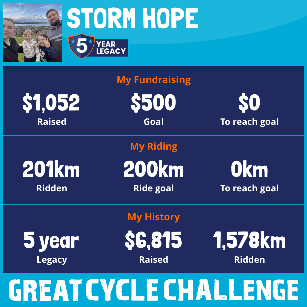 This year, the Hope family is aiming to ride 200km and raise $500 to support kids fighting cancer. Since we first joined in 2021, we’ve raised over $5,700, and we’re hoping to hit the $6,000 milestone by the end of this challenge!