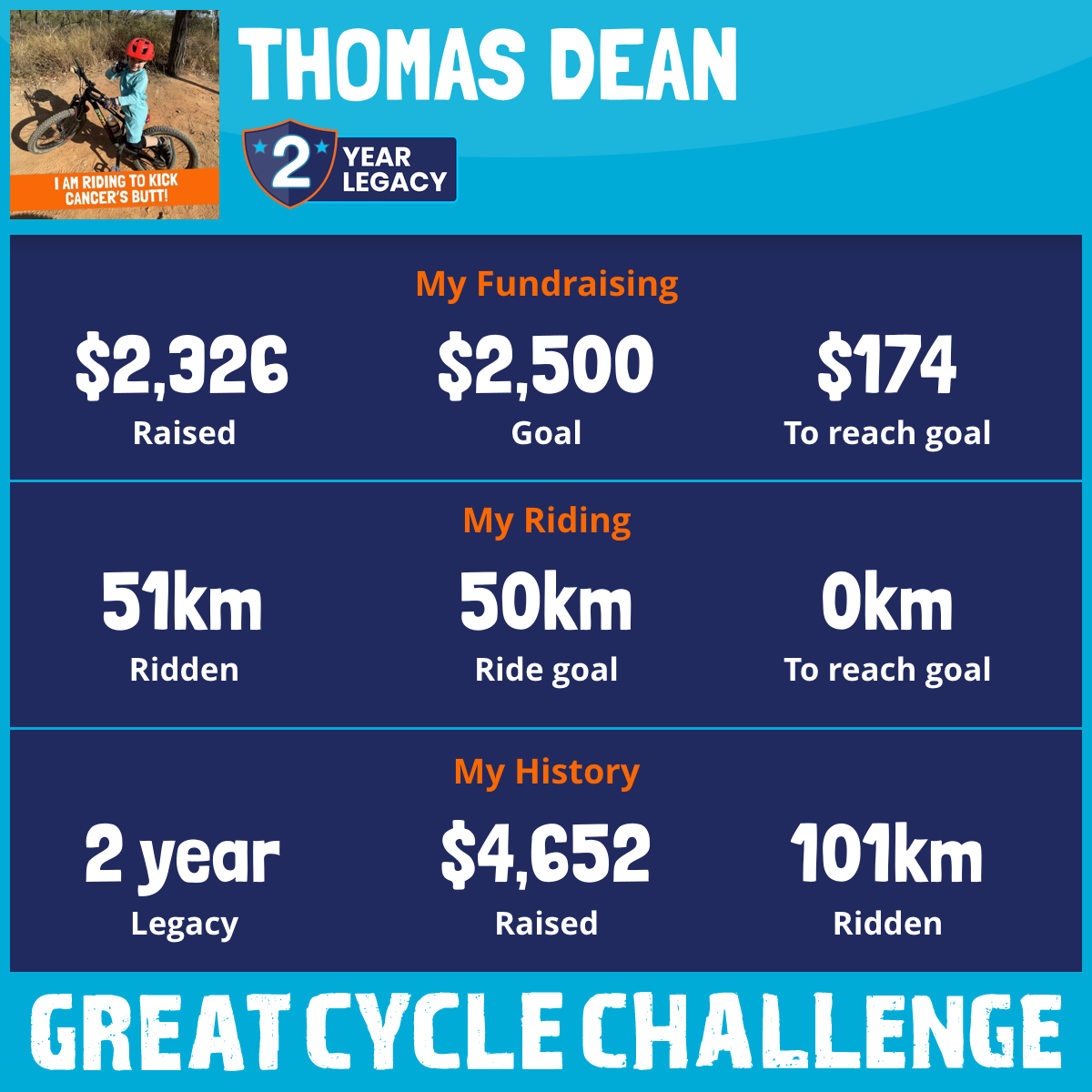 This October, I am taking part in the Great Cycle Challenge to fight kids' cancer! I have given myself a goal of 50kms which is really far for my little legs. Sometimes my legs get tiered, but that’s ok, I can still keep riding.