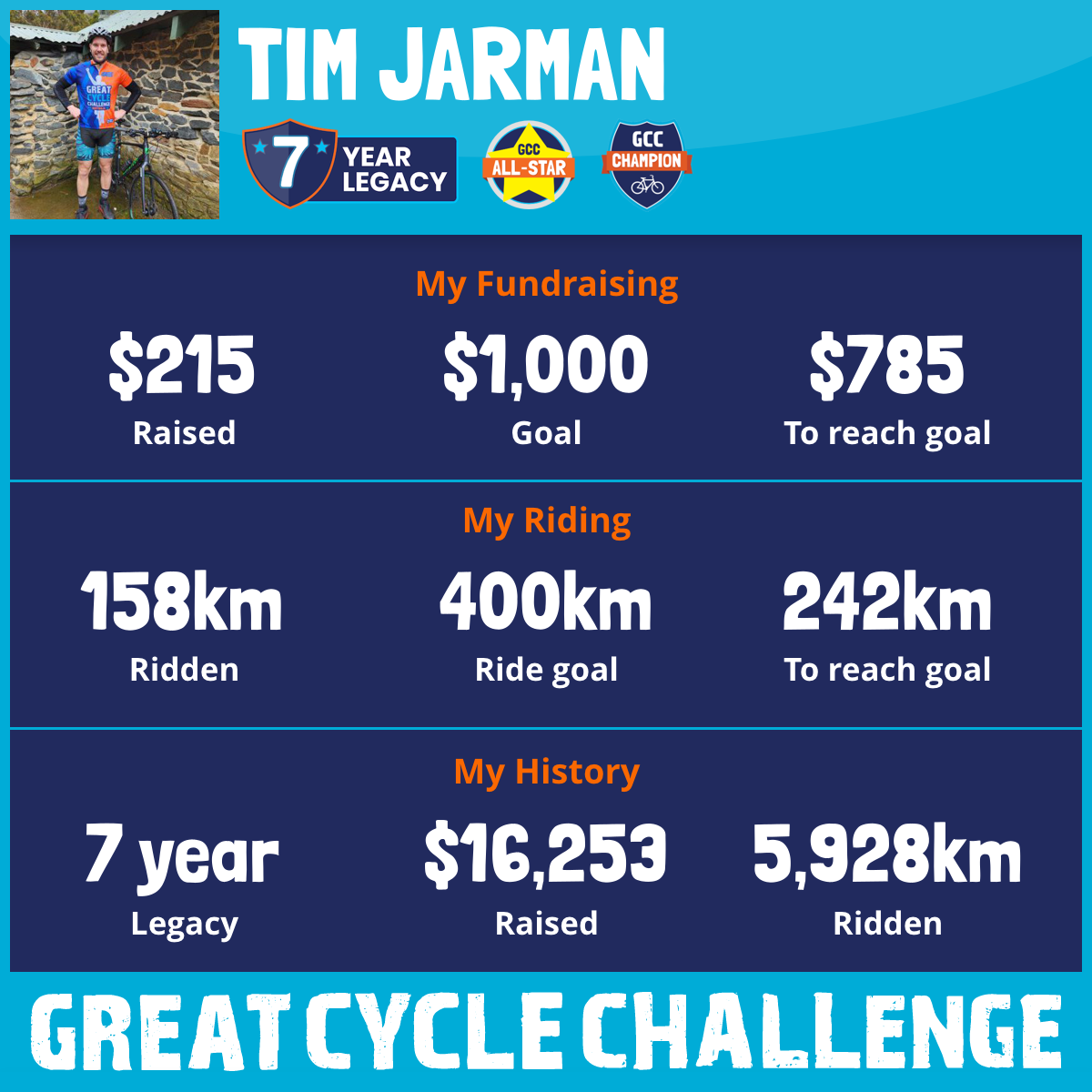 This is my sixth year taking part in the Great Cycle Challenge and once again I am keen to challenge myself to raise funds to fight kids cancer! After my massive month last October completing two half everests, this year I am continuing the theme of long stints on the bike with a 24 hour challenge.