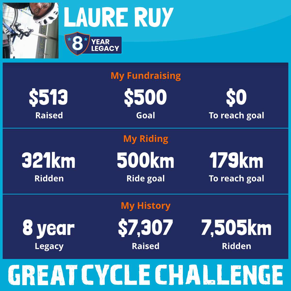 Year number eight. The cure for cancer continues to be beyond my reach. So instead, I'm going to be contributing to the eradication of this disease by cycling my little heart out! This year I'll be aiming to cycle 500km.