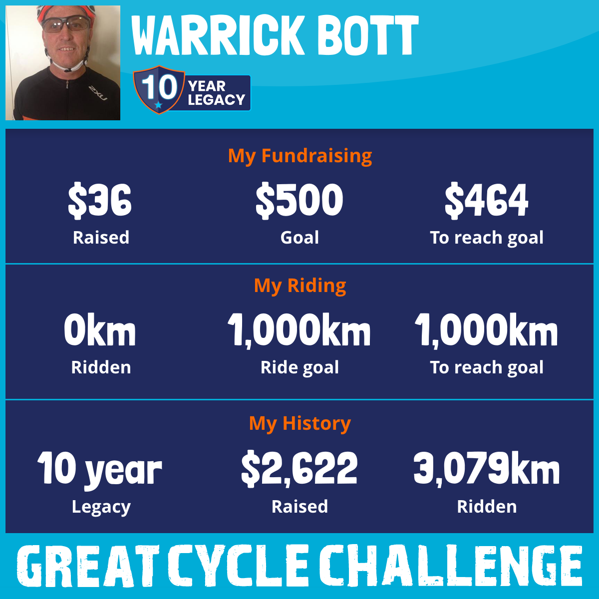 I am riding 1,000 km in memory of my myself, Warrick Bott. Please sponsor me and support my challenge to fight kids' cancer and save little lives.