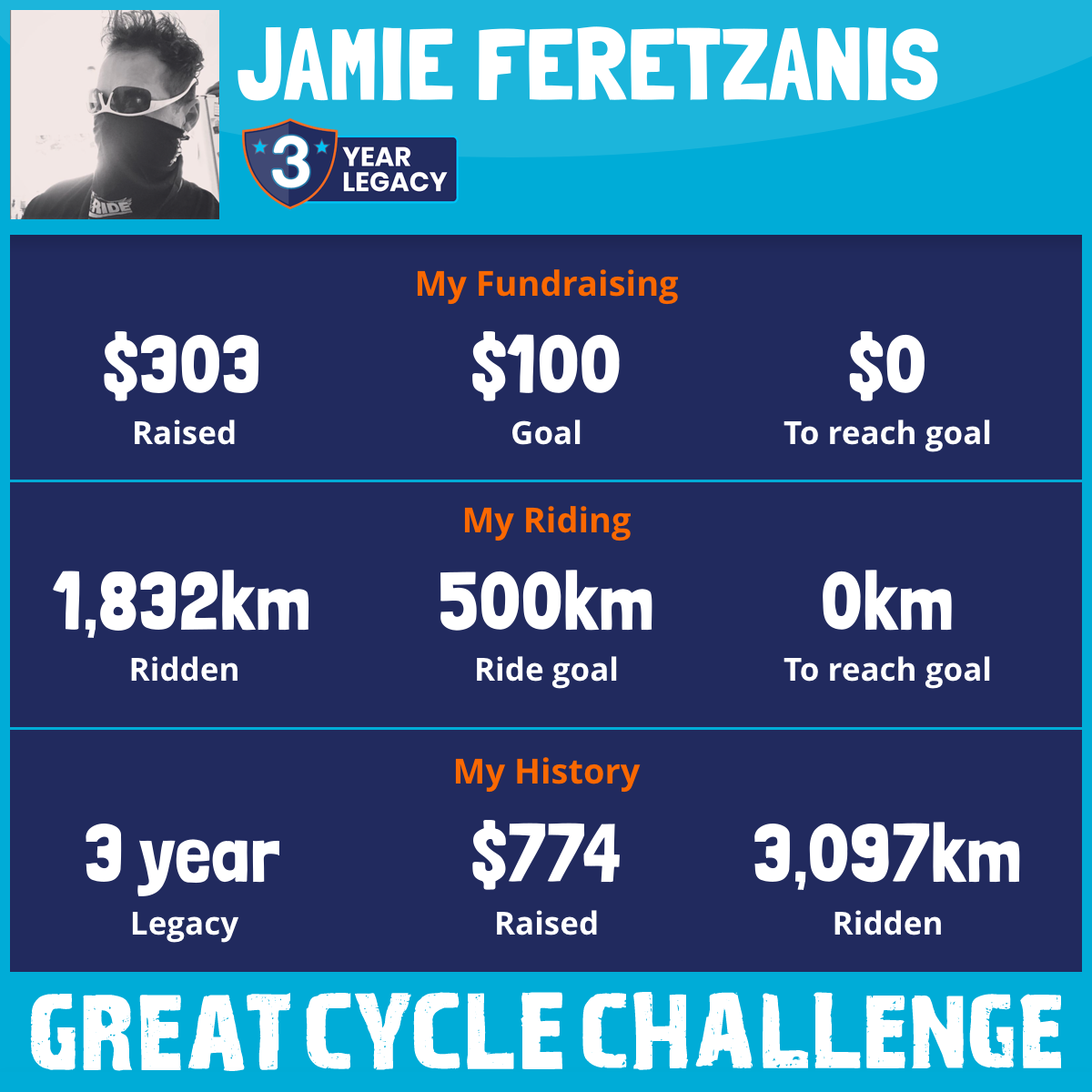 1,832 km Ridden$303 Raised2026